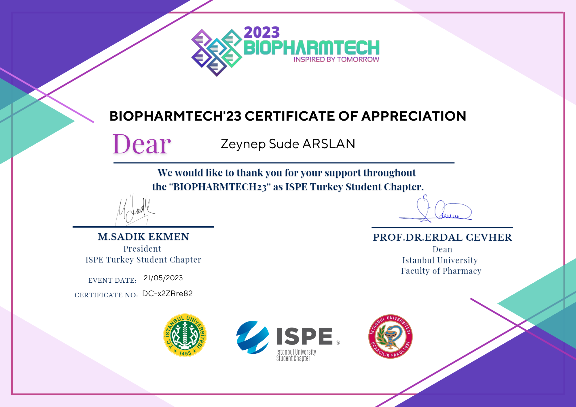 BIOPHARMTECH'23 CERTIFICATE OF APPRECIATION